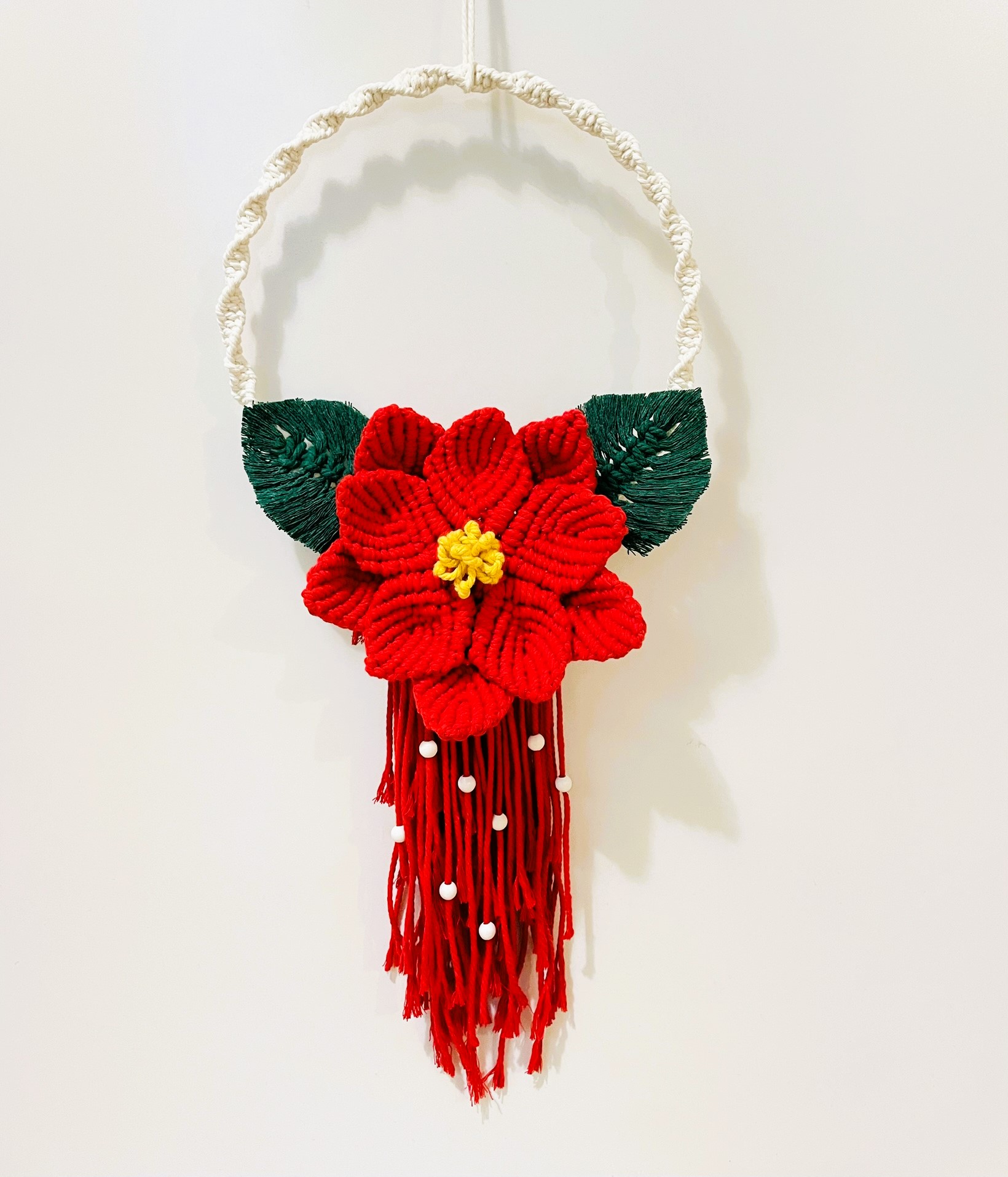 Tuo joulun lämmin tunnelma kotiisi tällä upealla, käsityönä tehdyllä makramee-joulutähtikranssilla! Kranssi on valmistettu 100 % puuvillalangasta ja koristeltu valkoisilla puuhelmillä, jotka tuovat ilmeeseen keveyttä ja juhlan tuntua. Keskellä loistaa näyttävä punainen joulutähti vihreine lehtineen ja kauniisti laskeutuvine hapsuineen.