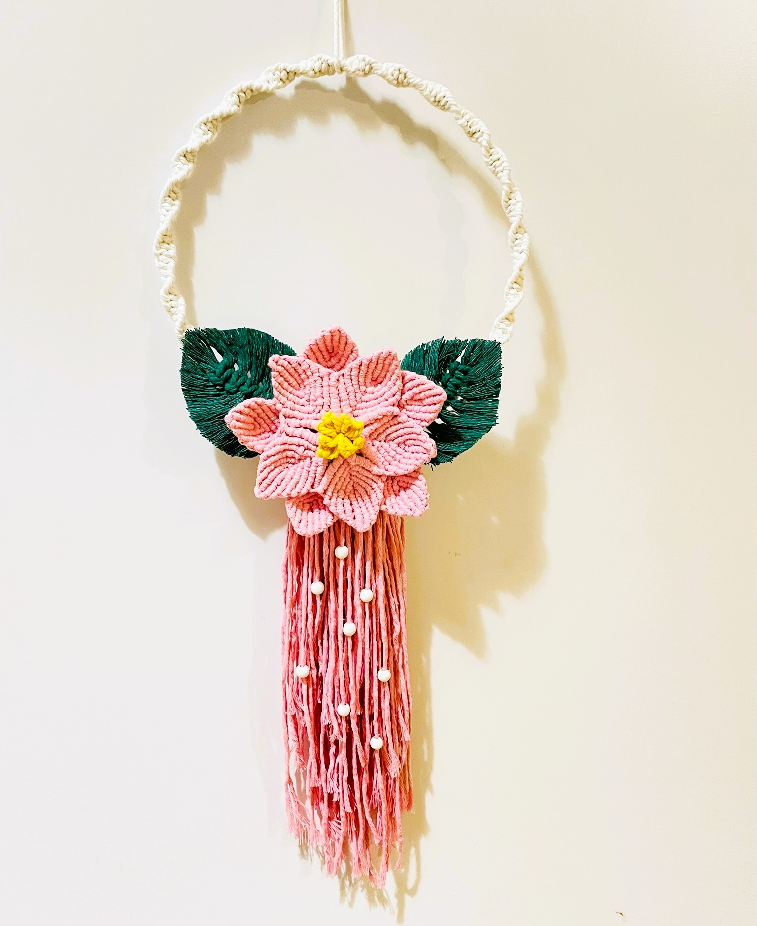 Tuo joulun lämmin tunnelma kotiisi tällä upealla, käsityönä tehdyllä makramee-joulutähtikranssilla! Kranssi on valmistettu 100 % puuvillalangasta ja koristeltu valkoisilla puuhelmillä, jotka tuovat ilmeeseen keveyttä ja juhlan tuntua. Keskellä loistaa näyttävä vaaleanpunainen joulutähti vihreine lehtineen ja kauniisti laskeutuvine hapsuineen.